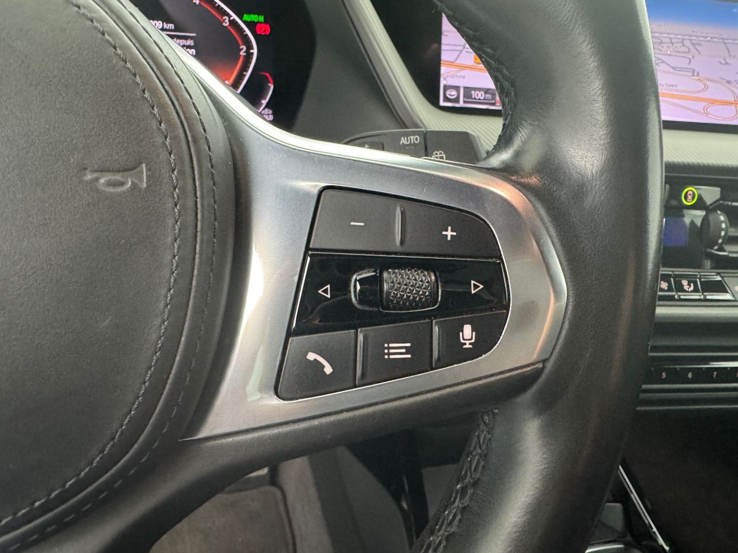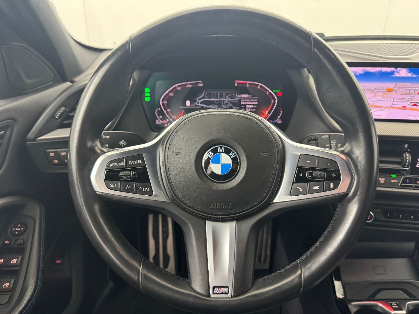 • Volant m gaine cuir trois branches, aplati en bas et marque a 12 heures en noir. volant en cuir noir 'walknappa' avec surpiqures noires, inserts chrome nacre et repose-pouce dans le volant. logo m sur la base du volant.