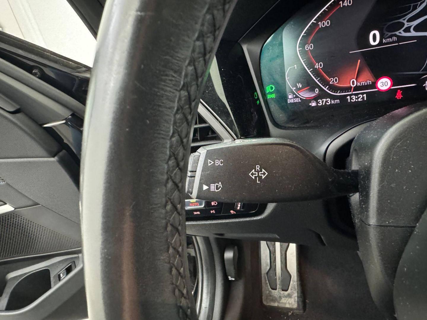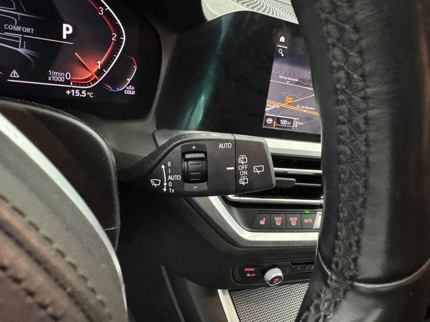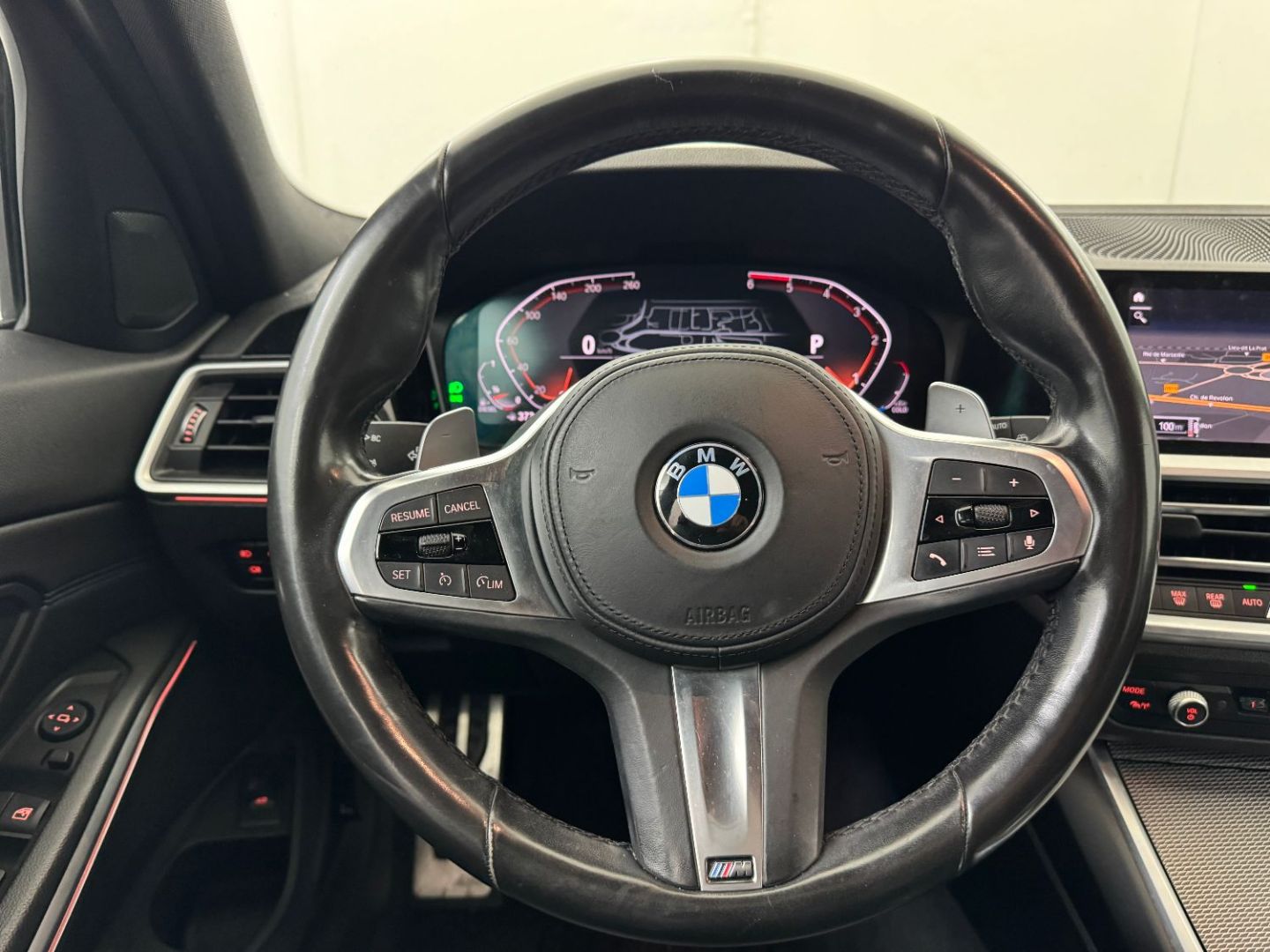 Volant m gaine cuir trois branches, aplati en bas et marque a 12 heures en noir. volant en cuir noir 'walknappa' avec surpiqures noires, inserts chrome nacre et repose-pouce dans le volant. logo m sur la base du volant.