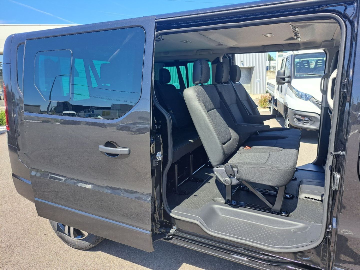• Porte laterale gauche coulissante vitre ouvrante + banquette fixe avec rangement